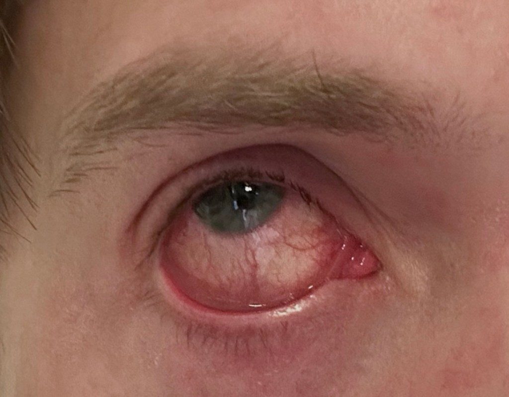 ‘Conjunctivitis’ it’s called, when the white in your eyes is inflamed and turns red. Also known as “Pink eye”. It can be caused by allergies, bacteria and viruses. In my case, it’s definitely viral, as I got regular cold symptoms. Adenoviruses are one of the three main families of viruses that cause the common cold. The other two are Coronaviruses (not the Covid-19 variants) and Rhinoviruses.